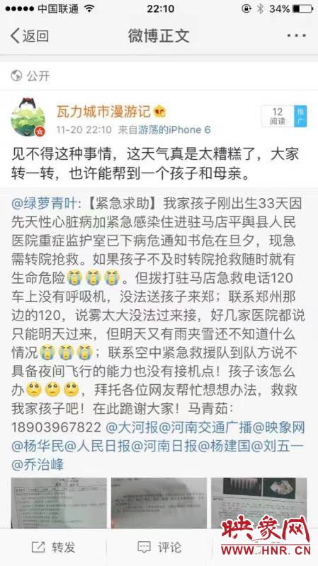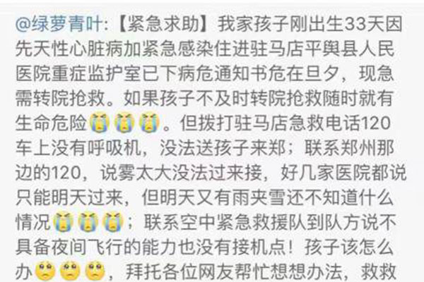 11月20日晚,一條微博牽動著無數(shù)人的心。駐馬店平輿縣一個剛剛出生33天的嬰兒因先天性心臟病加緊急感染被駐馬店市平輿縣人民醫(yī)院下達(dá)了病危通知書,但當(dāng)?shù)蒯t(yī)療條件有限,患兒無法得到及時有效的治療,急需轉(zhuǎn)院治療,但聯(lián)系的鄭州醫(yī)院因?yàn)樘鞖庠驘o法前往。