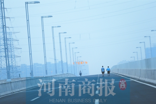 在鄭州市南三環(huán)京廣路口向南的高架橋上鍛煉玩耍的人很多。