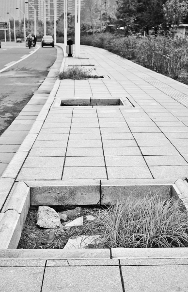 樹坑內(nèi)沒(méi)有種樹,長(zhǎng)了野草。