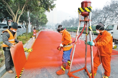 “機(jī)動(dòng)車道6米寬,鋪設(shè)‘綠道’的自行車道也為6米寬??磻T了灰黑色的路面,在看到色彩明銳的‘綠道’后肯定覺得眼前一亮?!G道’只是叫法,并不是說道路外觀一定是綠色的,在景觀設(shè)計(jì)中,‘綠道’往往有著更深更廣的內(nèi)涵?!惫こ特?fù)責(zé)人呂先生告訴記者,彩色瀝青厚度僅為1到2毫米,壽命在5年以上,具有警示、防滑、降噪、美觀等特點(diǎn)。“我國‘綠道’通常以警示色紅色為主打,主要作用是打造人車分離模式,供騎車者和步行者休閑使用?!?/p>